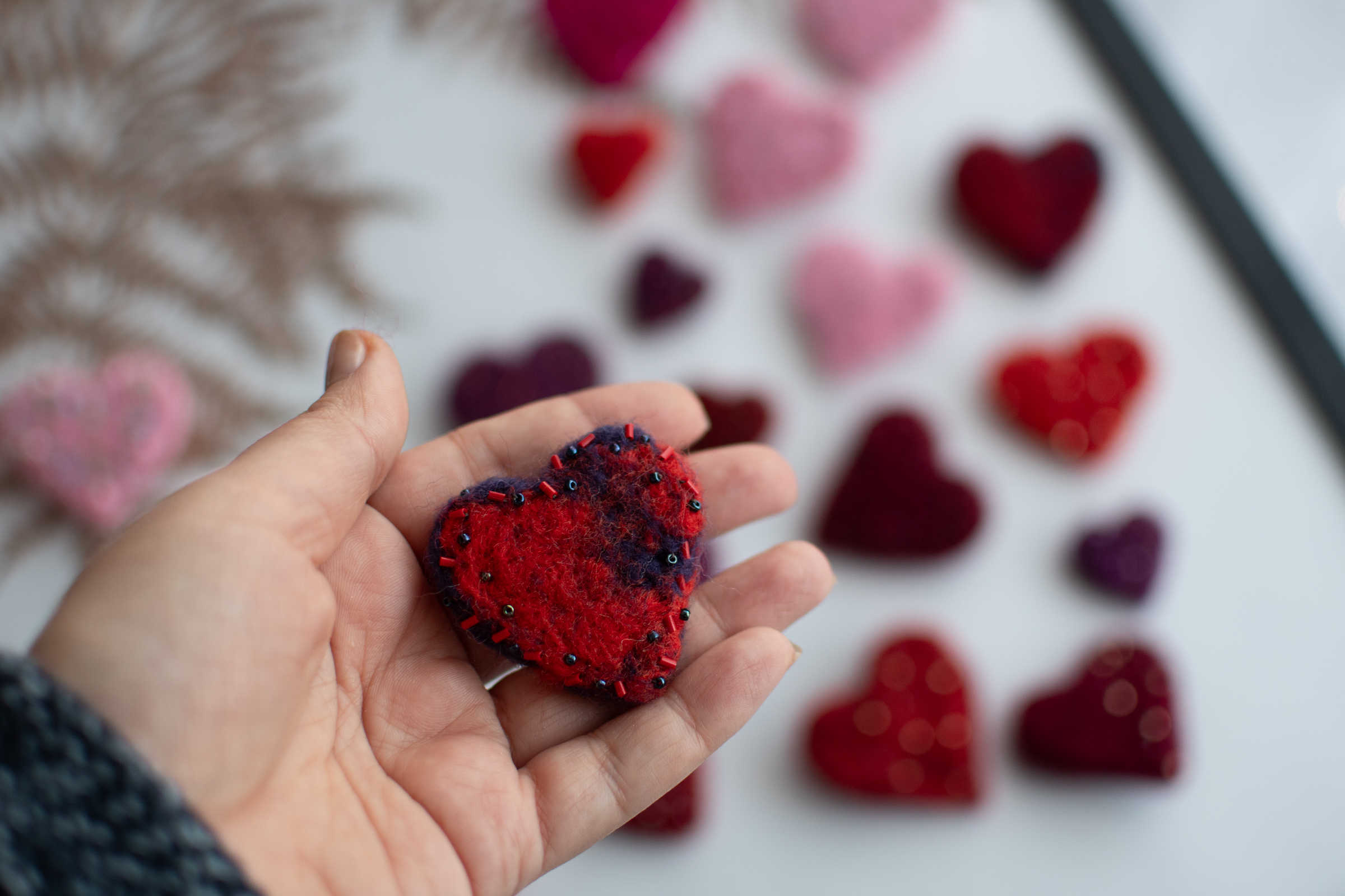 Brosa realizata manual din lana impaslita si decorata cu margele japoneze.